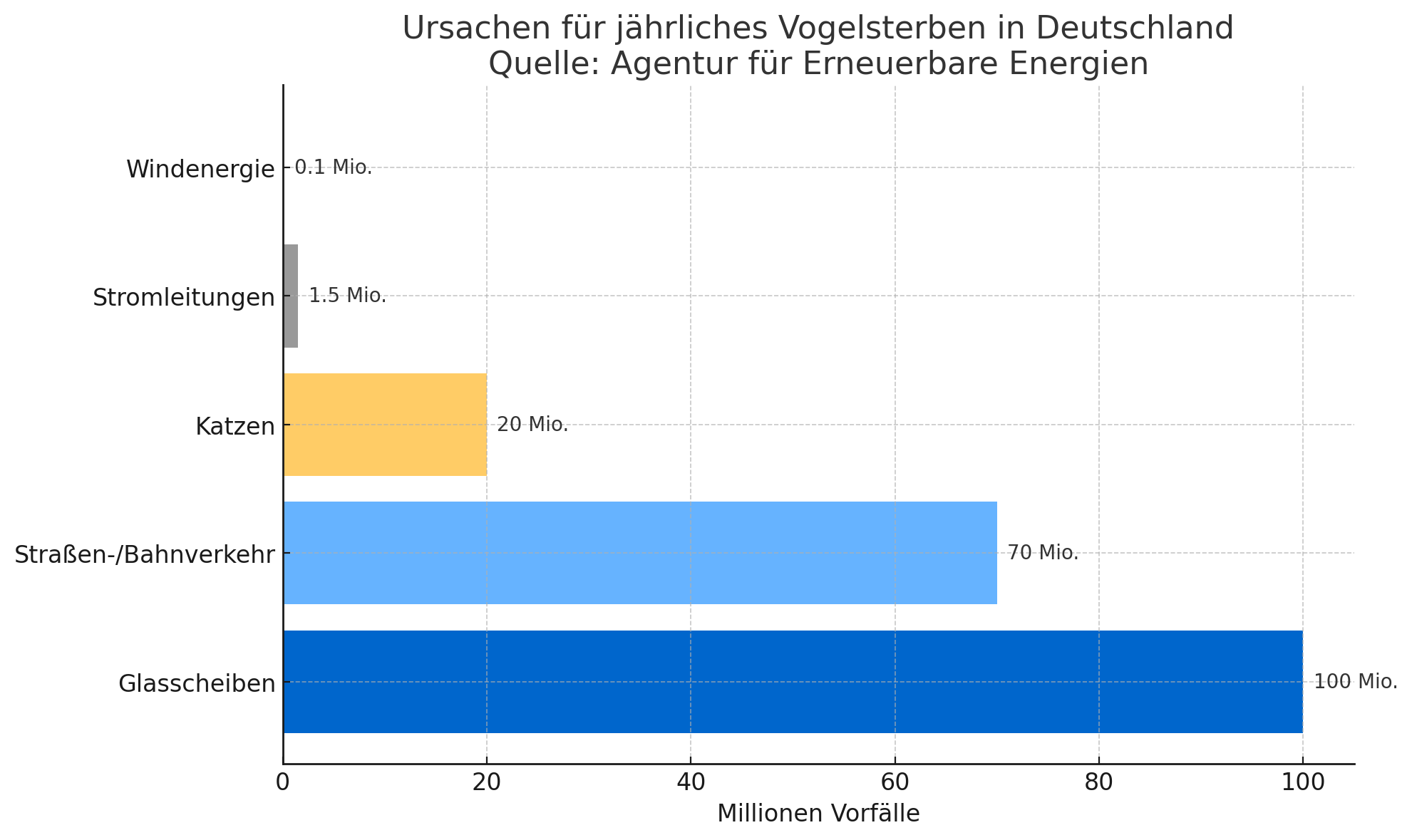 Zwar kann Vogelschlag vorkommen, doch die Zahlen sind deutlich niedriger als bei anderen Ursachen wie Straßenverkehr, Glasfassaden oder Katzen. Standortprüfungen und technische Maßnahmen verringern das Risiko weiter.